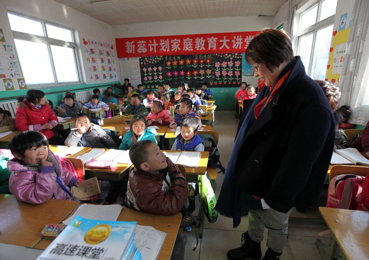 爱心捐赠人为龙马小学的学生分发文体用品