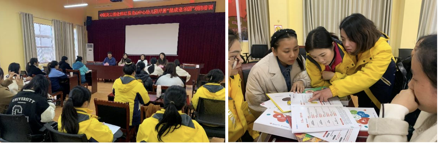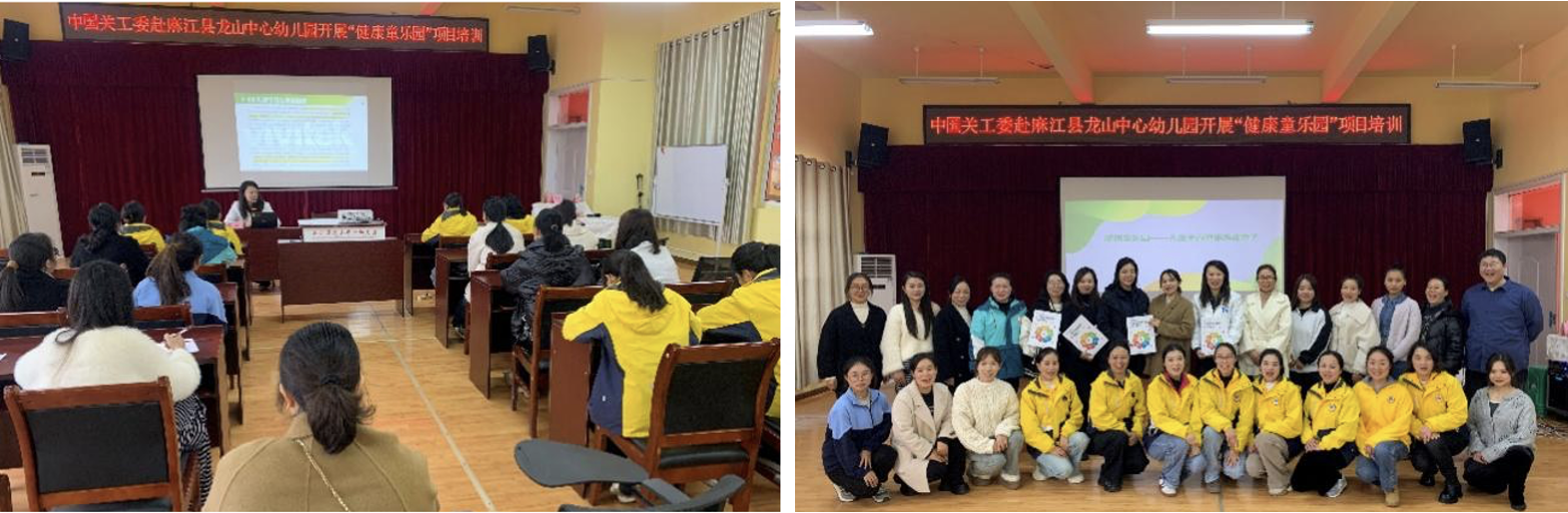 11月19日,健康童乐园项目组在贵州省黔东南苗族侗族自治州麻江县龙山中心幼儿园举行了教师培训活动,共有18位老师参加。培训讲师贺琼老师围绕“21个健康素养知识点”的重点为大家讲解儿童全面健康游戏盒子课程使用方法及技巧。麻江县关工委和教体局对培训很重视,学前教育服务中心老师全程参与,各幼儿园老师培训认真投入。一线教师师资素质高,均能跟随互动式培训,并参与其中。