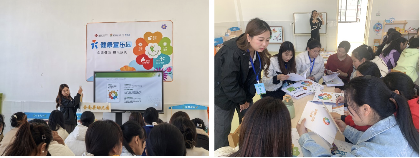 12月3日,健康童乐园项目组在江西省赣州市全南幼儿园举行了教师培训活动。此次培训共有35位老师参加。培训讲师张雪通过膳食营养类目下的《先有蛋》的绘本等四个课程的活动案例分析,帮助项目地老师更好的了解项目。老师们根据自身教室的情况绘制玩教具摆放图,利于下一步工作的开展。整个过程老师的参与度和完成度都很好。