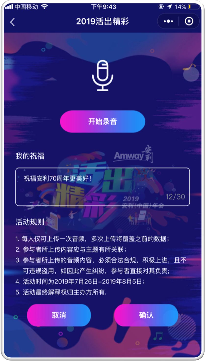 你是不是一直在等这样一个机会?想给创业路上的伙伴们点赞表白,想对安利提供的事业机会大声示爱? 来呀!话筒现在就递给你,用你的Lucky Voice为新安利打Call吧!